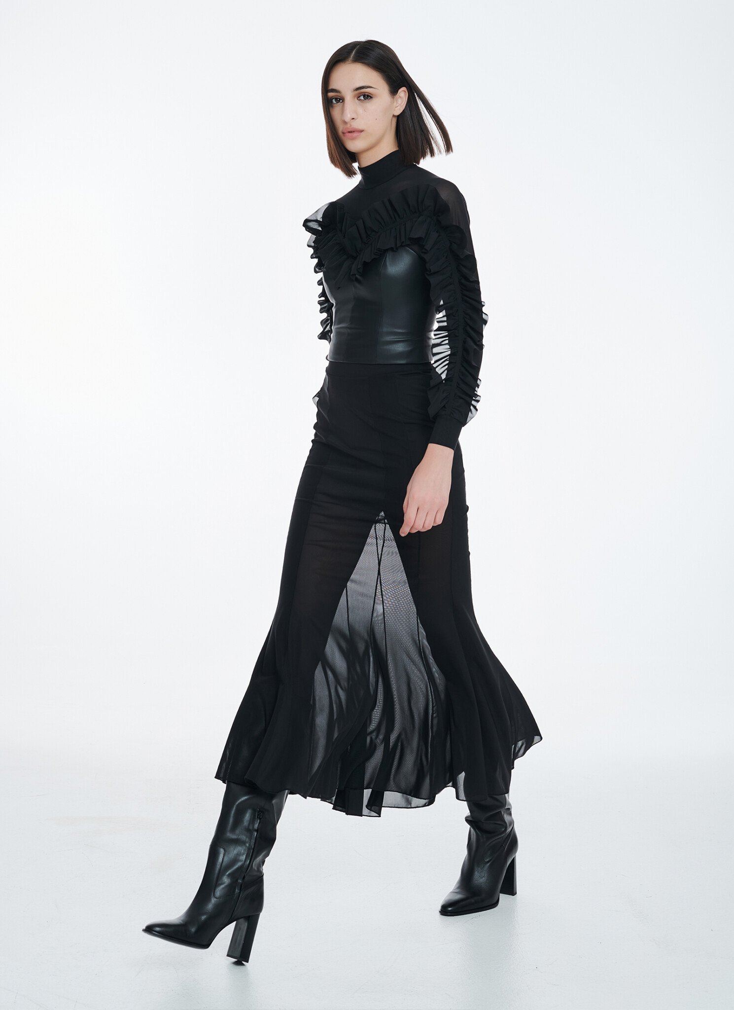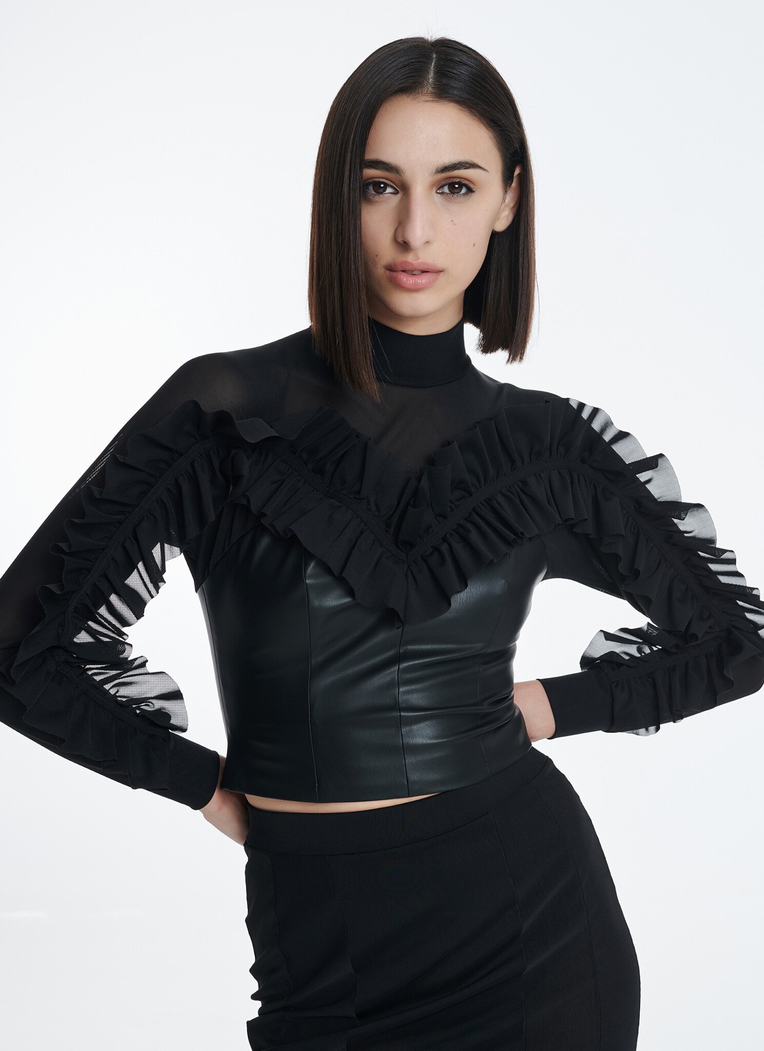 Top in slightly stretch fabric. Traced with dramatic ruffles along the front side and the sleeves, this feminine top is cut in a slim silhouette from ultra soft eco-leather and elasticated mesh. Wear it with an eco-leather or a mesh skirt depending on your mood. Eco-leather and mesh fabric Zip fastening at back Hand wash / no tumble dry / low iron. Η αγορά γίνεται μέσω του επίσημου site του CUTCUUTUR — συνεργαζόμαστε μαζί τους ως affiliate και χαιρόμαστε πολύ γι αυτό. Η διαθεσιμότητα ενδέχεται να αλλάζει — αν το βλέπεις τώρα, μπορεί να μην το ξαναβρείς!