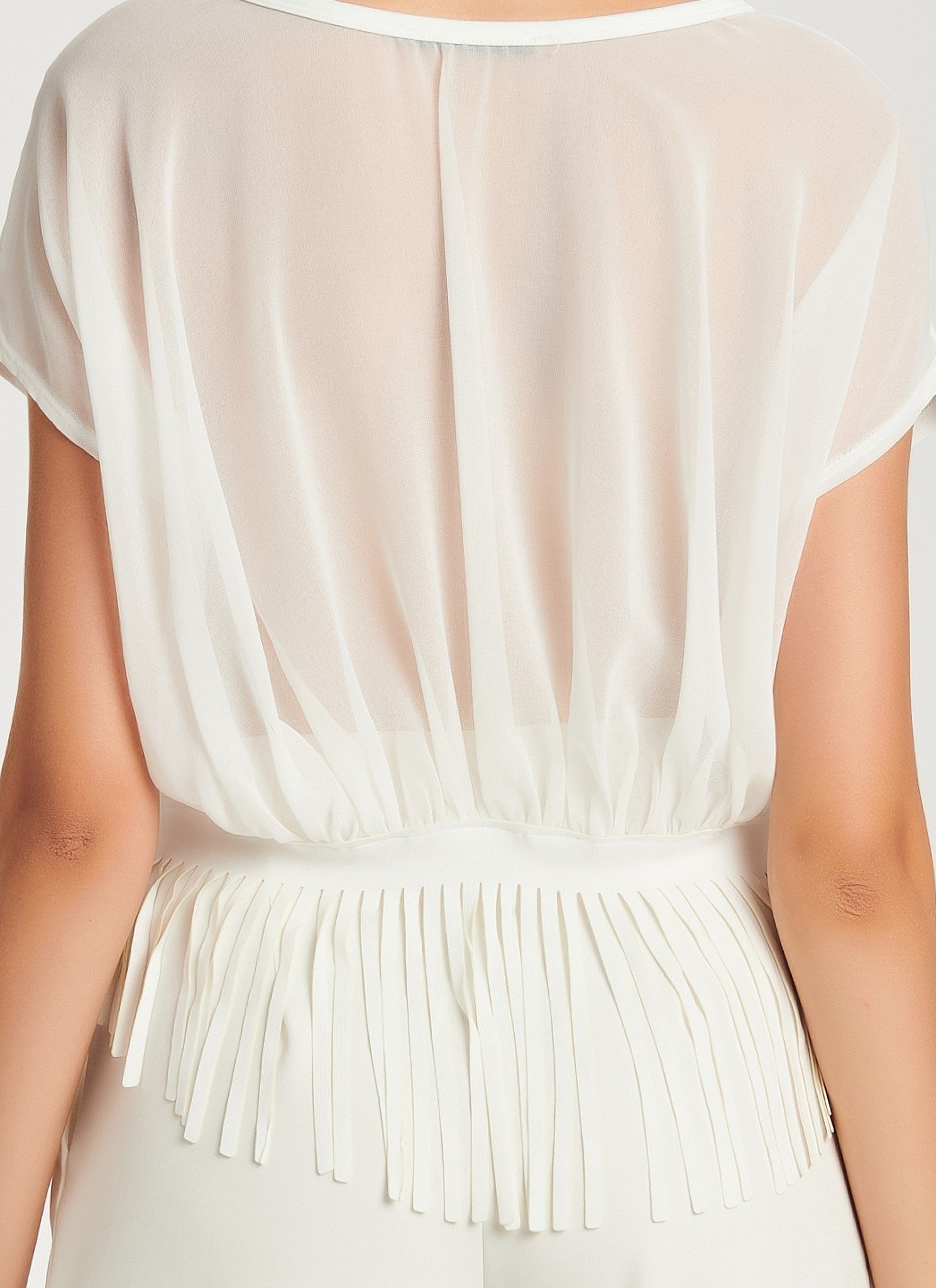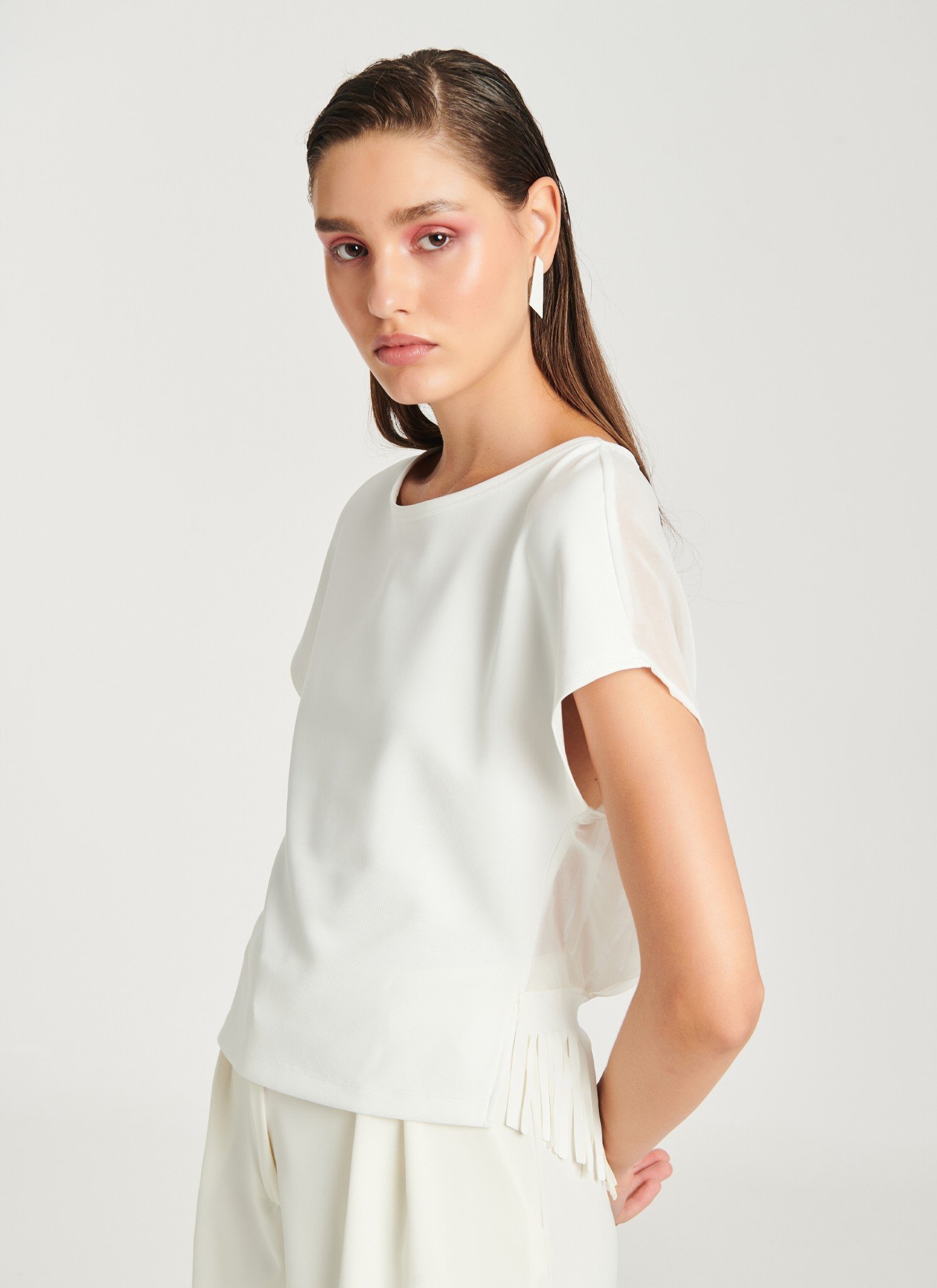 T-shirt in stretchy fabric. This T-shirt is so elegant that you definetely love it! Made from soft light scuba and airy chiffon it has a pleated back and fringed finishing. Try with the tonal cropped pants. also available in: black Light scuba & chiffon fabric Pleated chiffon and laser-cut fringes at back Hand wash / no tumble dry / low iron . Η αγορά γίνεται μέσω του επίσημου site του CUTCUUTUR — συνεργαζόμαστε μαζί τους ως affiliate και χαιρόμαστε πολύ γι αυτό. Η διαθεσιμότητα ενδέχεται να αλλάζει — αν το βλέπεις τώρα, μπορεί να μην το ξαναβρείς!