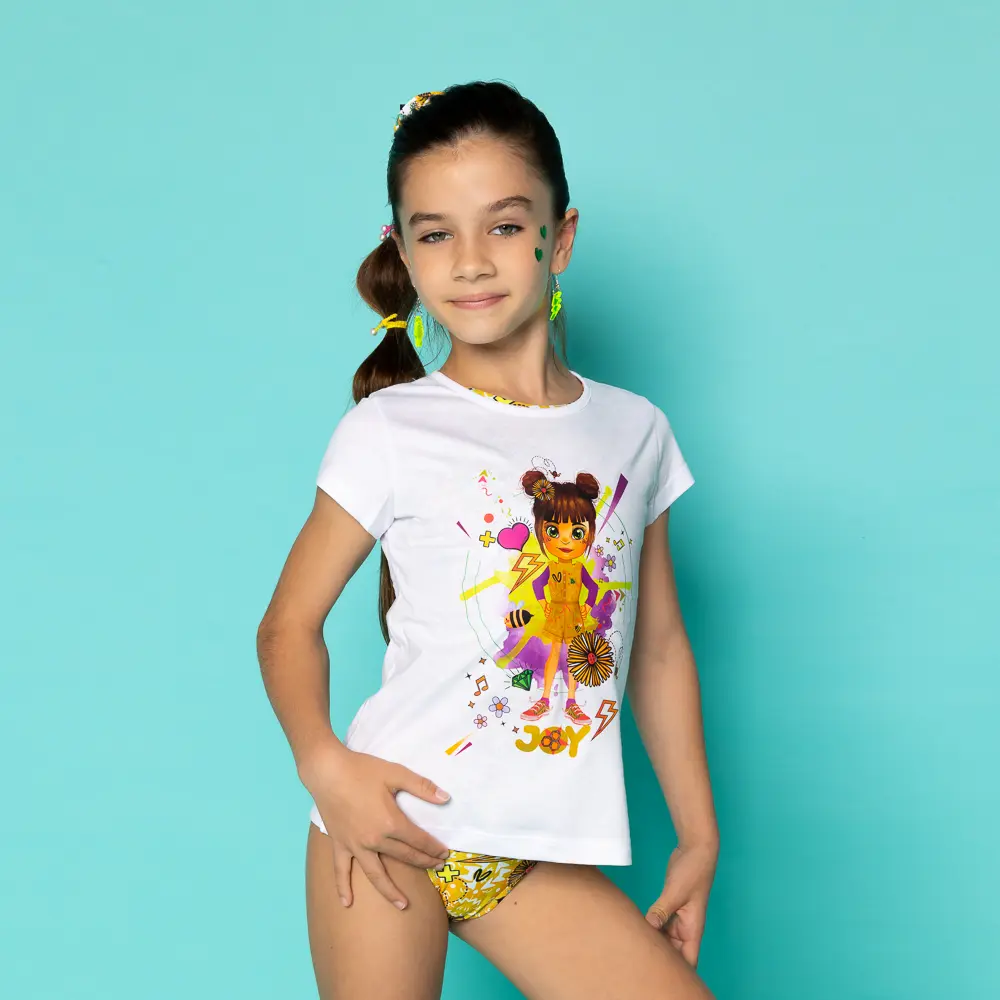 Μπλούζα λευκή από 100% βαμβάκι με στάμπα “Joy” μπροστά. Σημείωση: Το μοντέλο της φωτογραφίας είναι 9 χρονών με ύψος 1,35 και φοράει Μέγεθος: 8